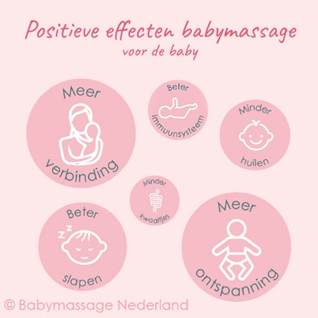 Massage vermindert allerlei babykwaaltjes (darmkrampjes, voorkeurshouding, overstrekken, doorkomende tandjes en verkoudheid). De massage zorgt voor ontspannen spieren en een betere doorbloeding. Je baby zal zich door de massage ook meer ontspannen. Deze effecten hebben een positieve werking op het verzachten van de babykwaaltjes.